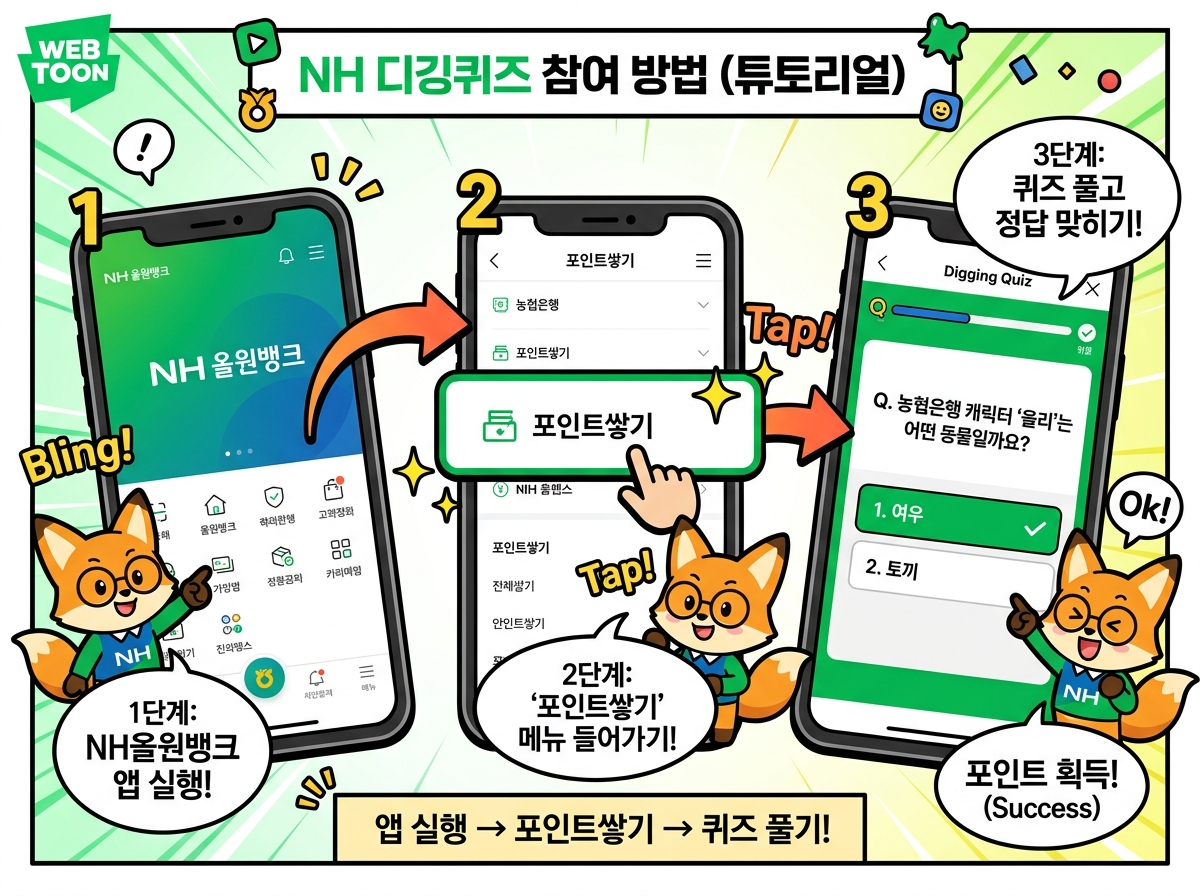 농협 올원뱅크 디깅퀴즈에 참여하는 방법은 정말 간단했어요. 먼저 NH올원뱅크 앱을 실행한 다음, 하단 메뉴에서 '포인트쌓기'를 선택하면 돼요.