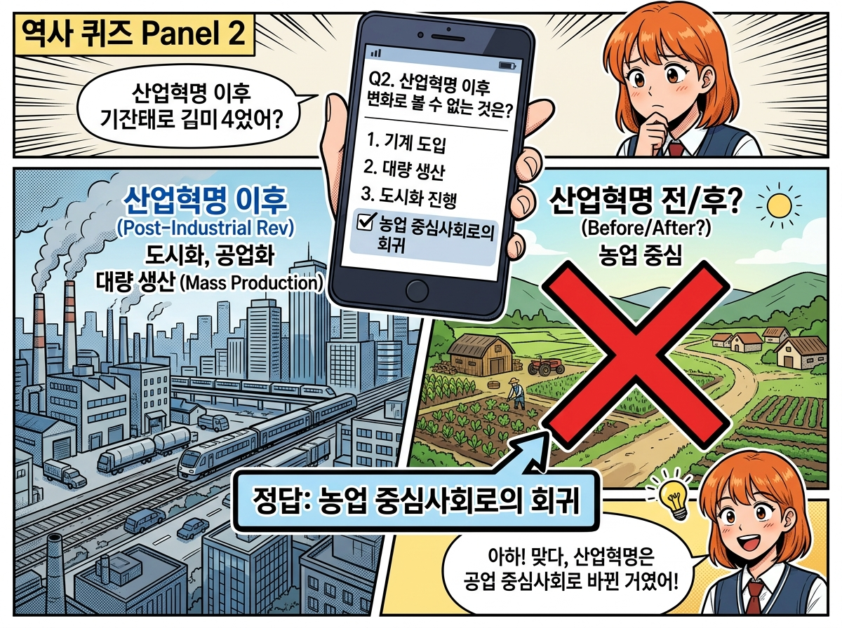 산업혁명은 농업 사회에서 벗어나 새로운 산업 시대로 진입하는 결정적인 전환점이었으니까요. 알고 보니 문제는 우리가 이미 알고 있는 기본적인 역사적 상식을 묻는 거였더라고요.