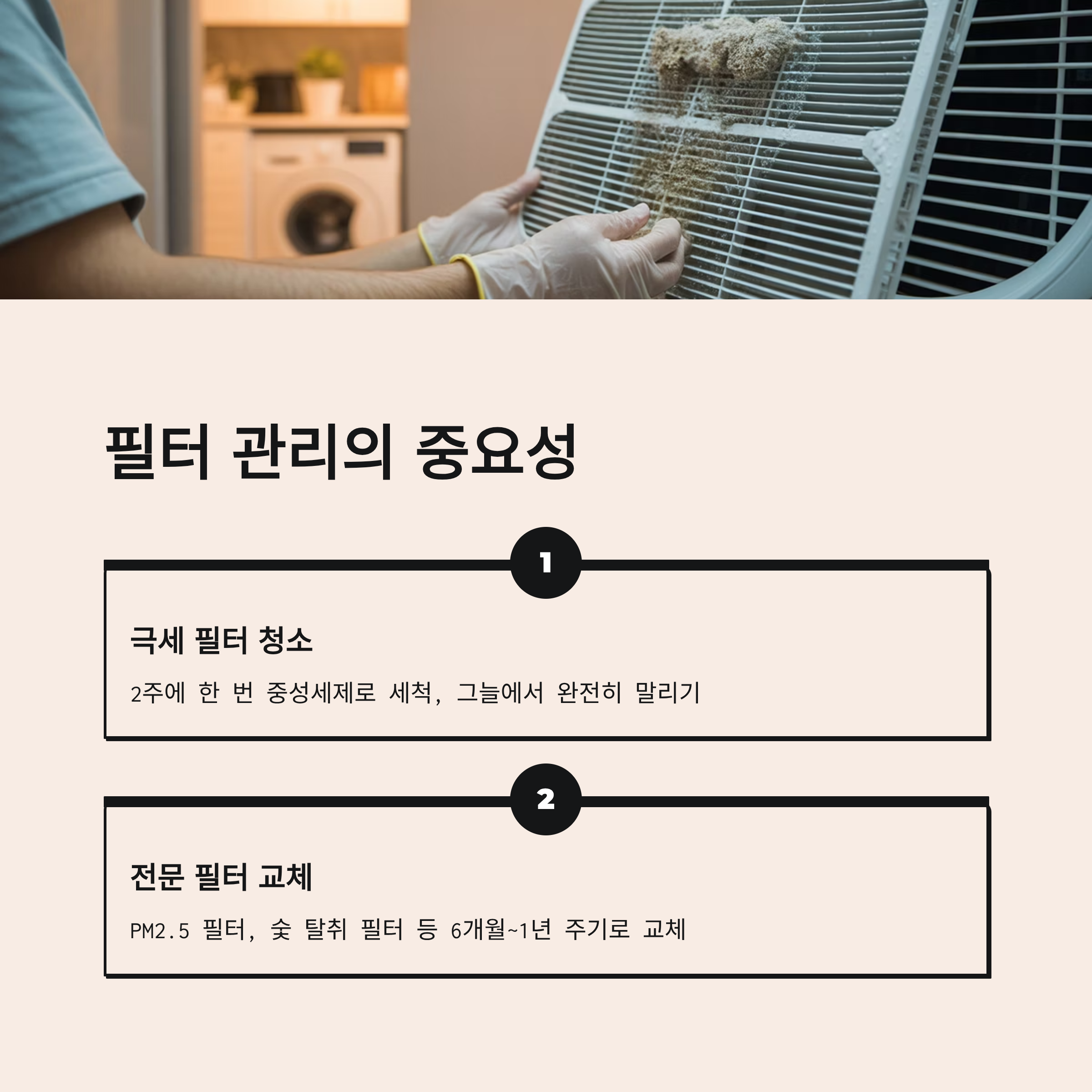 - 필터 관리의 중요성: 청정 기능이 아무리 좋아도 필터가 지저분하면 공기 청정 효과가 떨어지고 팬에 무리가 가서 전기 소모가 늘어날 수 있습니다. 쿰쿰한 냄새의 근본적인 원인을 제거하고, 전기세 절약을 위해서 필터 관리는 필수입니다.