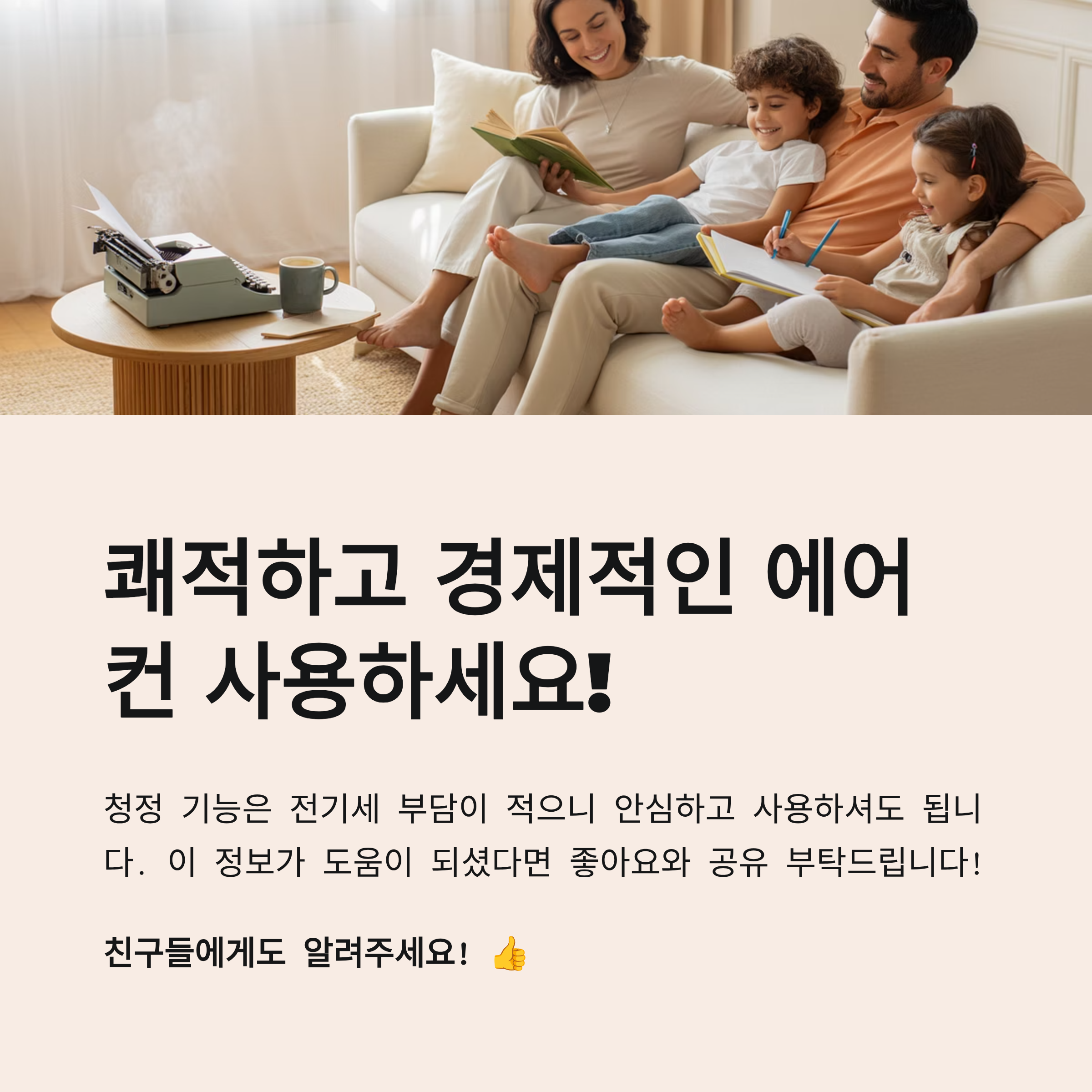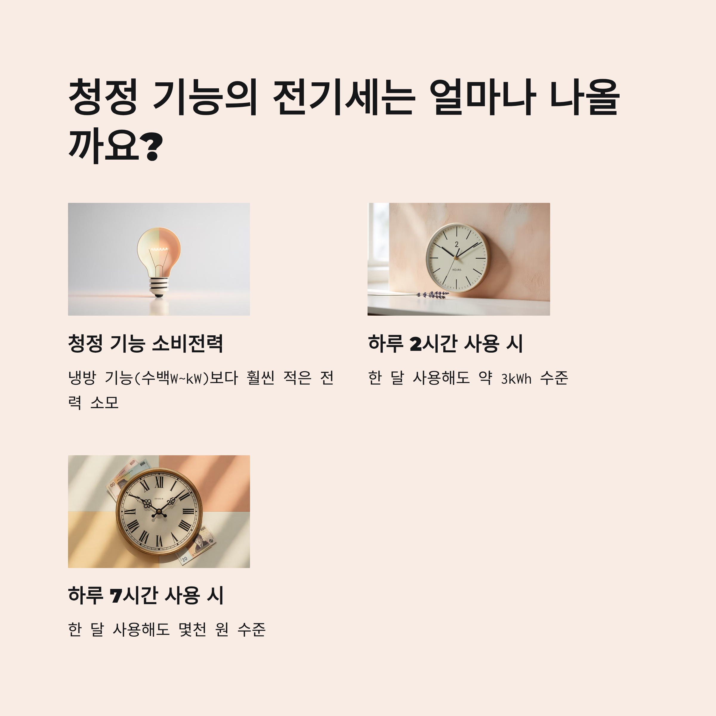 - 냉방 후 2시간 청정 기능 사용 시: 소비전력이 50W인 청정 기능을 하루 2시간 사용한다면, 하루에 100Wh(0.1 kWh)를 소모합니다. 한 달 내내 매일 사용해도 약 3 kWh 정도로, 전기 요금에 큰 영향을 주지 않습니다.