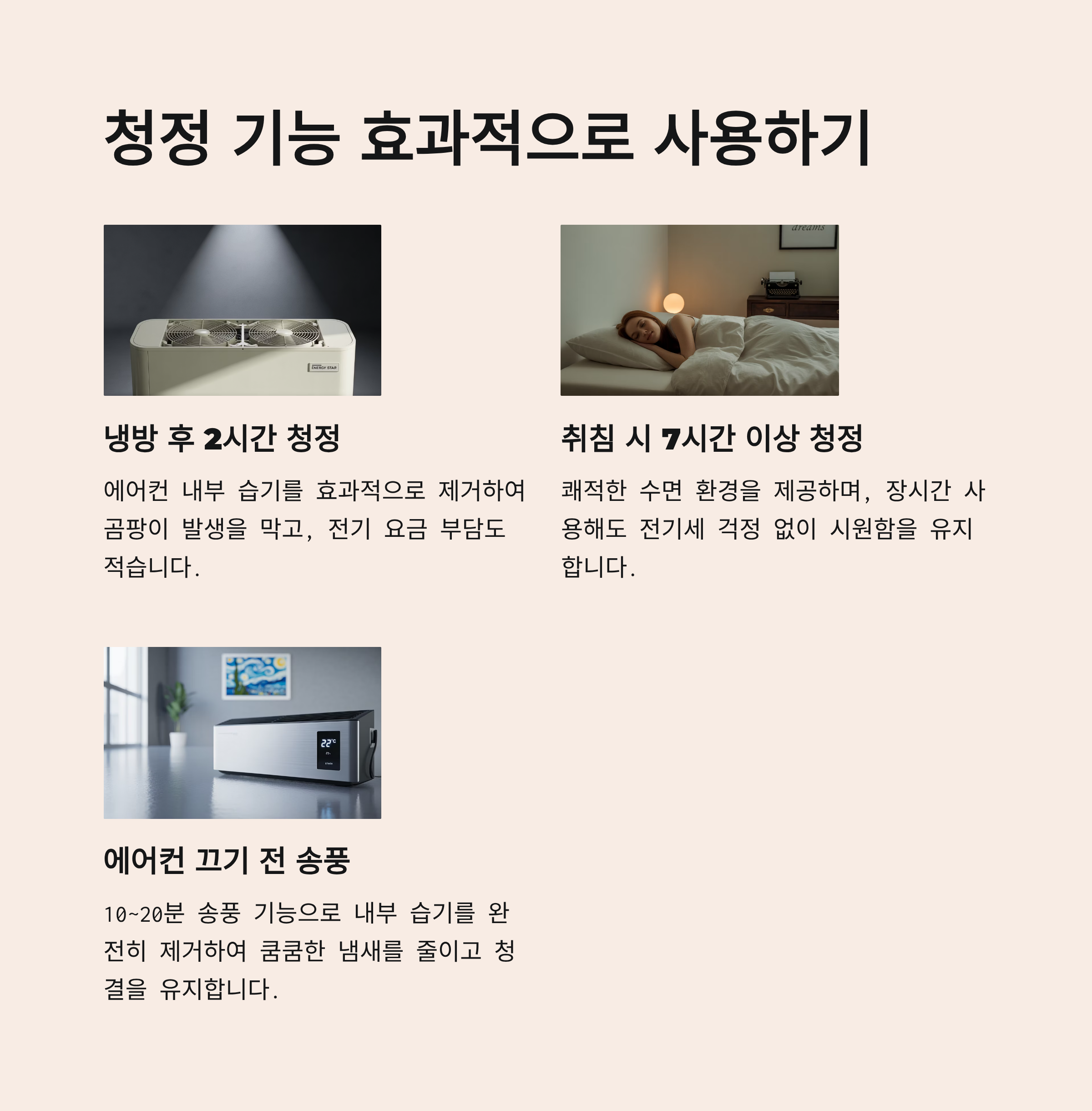 다음은 청정 기능을 효과적으로 사용하면서 전기료 부담을 줄이고, 냄새를 예방하는 구체적인 방법입니다.