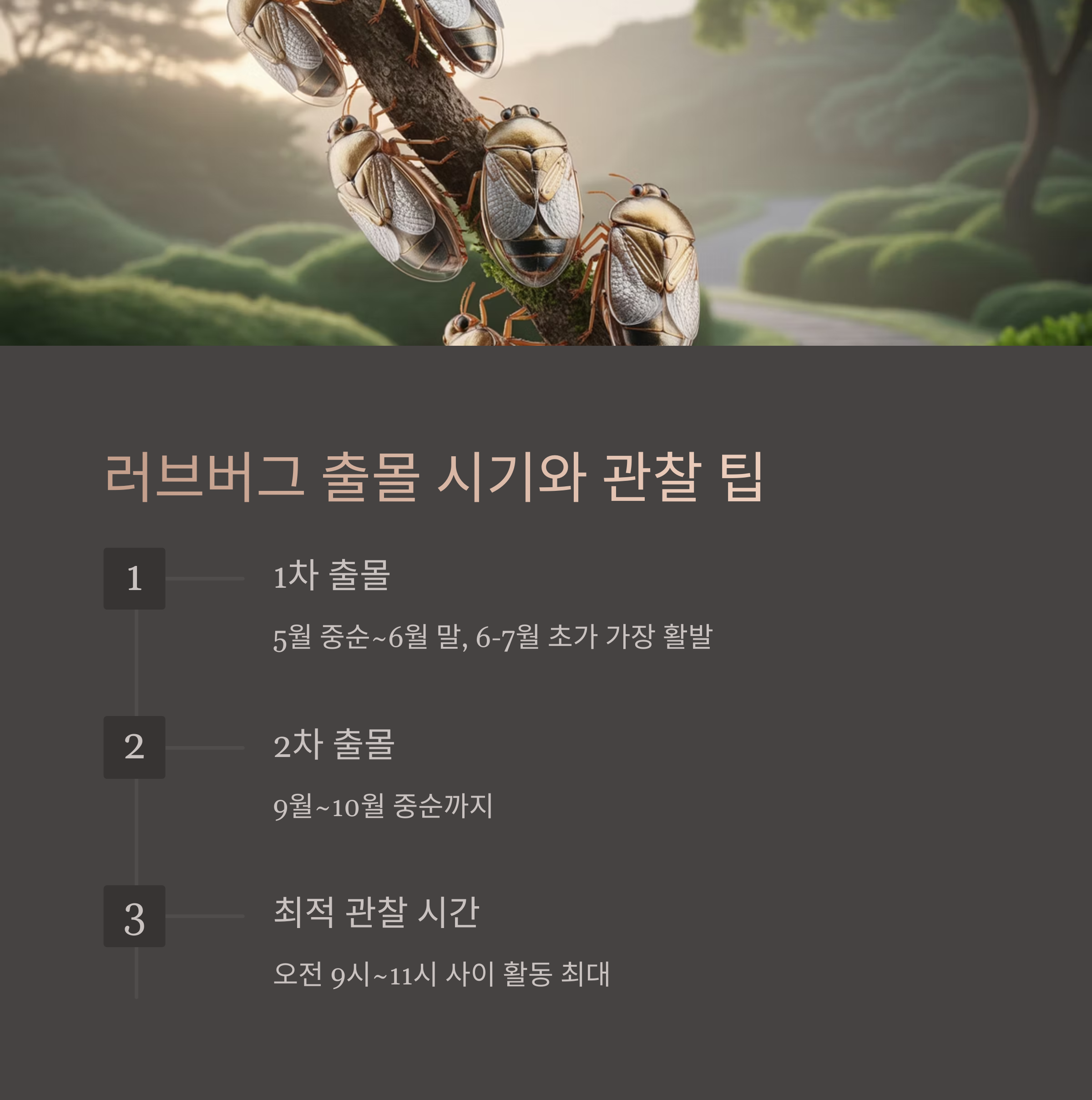 1차 출몰은 5월 중순부터 6월 말까지, 2차는 9월~10월 중순까지입니다. 6~7월 초가 가장 활발한 시기예요. - 관찰 시간대: