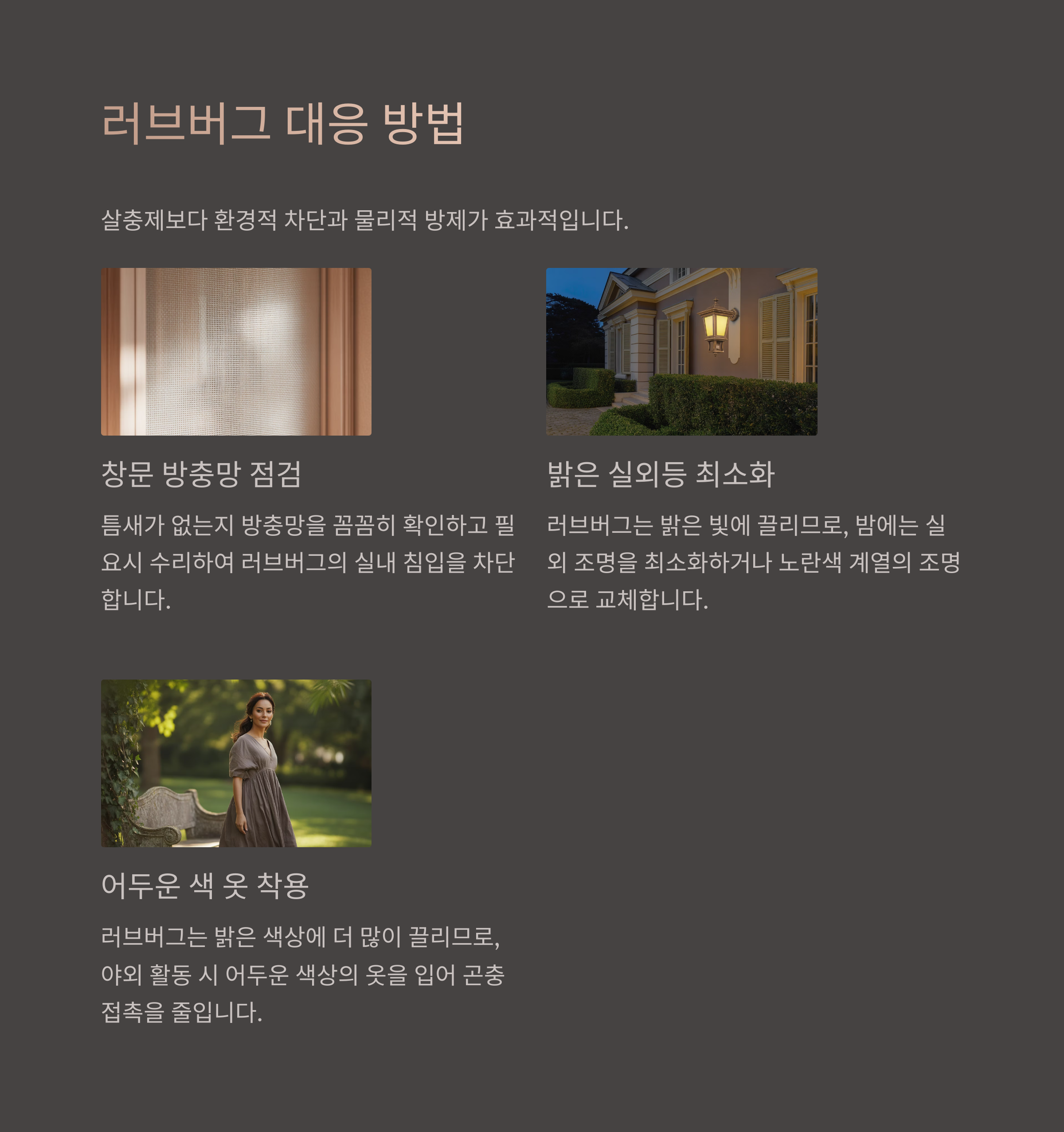 - 밝은 실외등 최소화 또는 타이머 설정