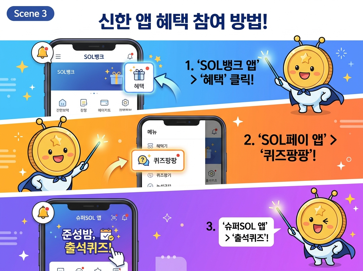 먼저, 쏠야구 퀴즈는 신한 SOL뱅크 앱의 '혜택' 메뉴에서 '쏠퀴즈'를 선택하면 되고요. 퀴즈팡팡은 신한 SOL페이 앱의 '혜택' 메뉴에서 '퀴즈팡팡'을 누르면 된답니다.