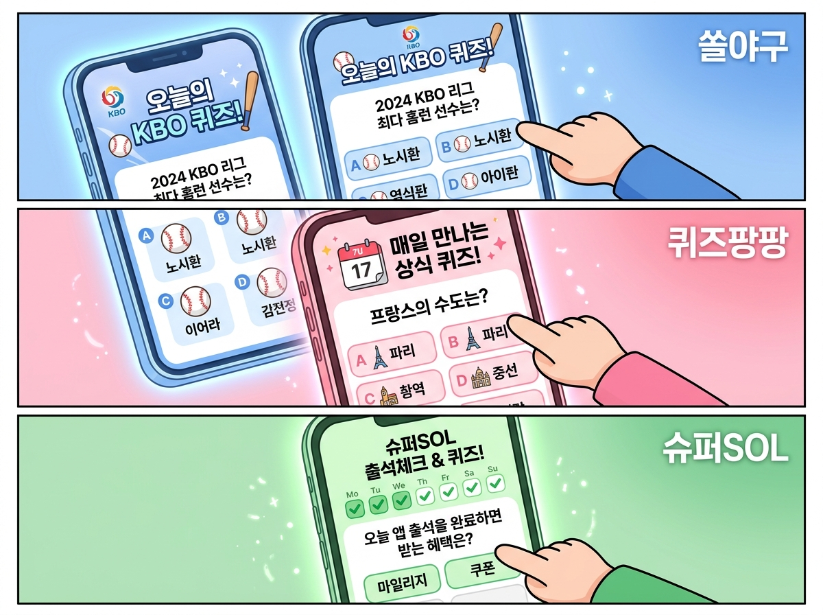 이런 퀴즈 앱테크는 매일 1분 정도의 시간 투자로 소소한 포인트를 쌓을 수 있다는 점이 매력이었어요. 특히 신한 쏠퀴즈는 야구 상식부터 시사, 그리고 간단한 출석체크까지 다양한 유형의 퀴즈를 제공해서 지루할 틈이 없더라고요.