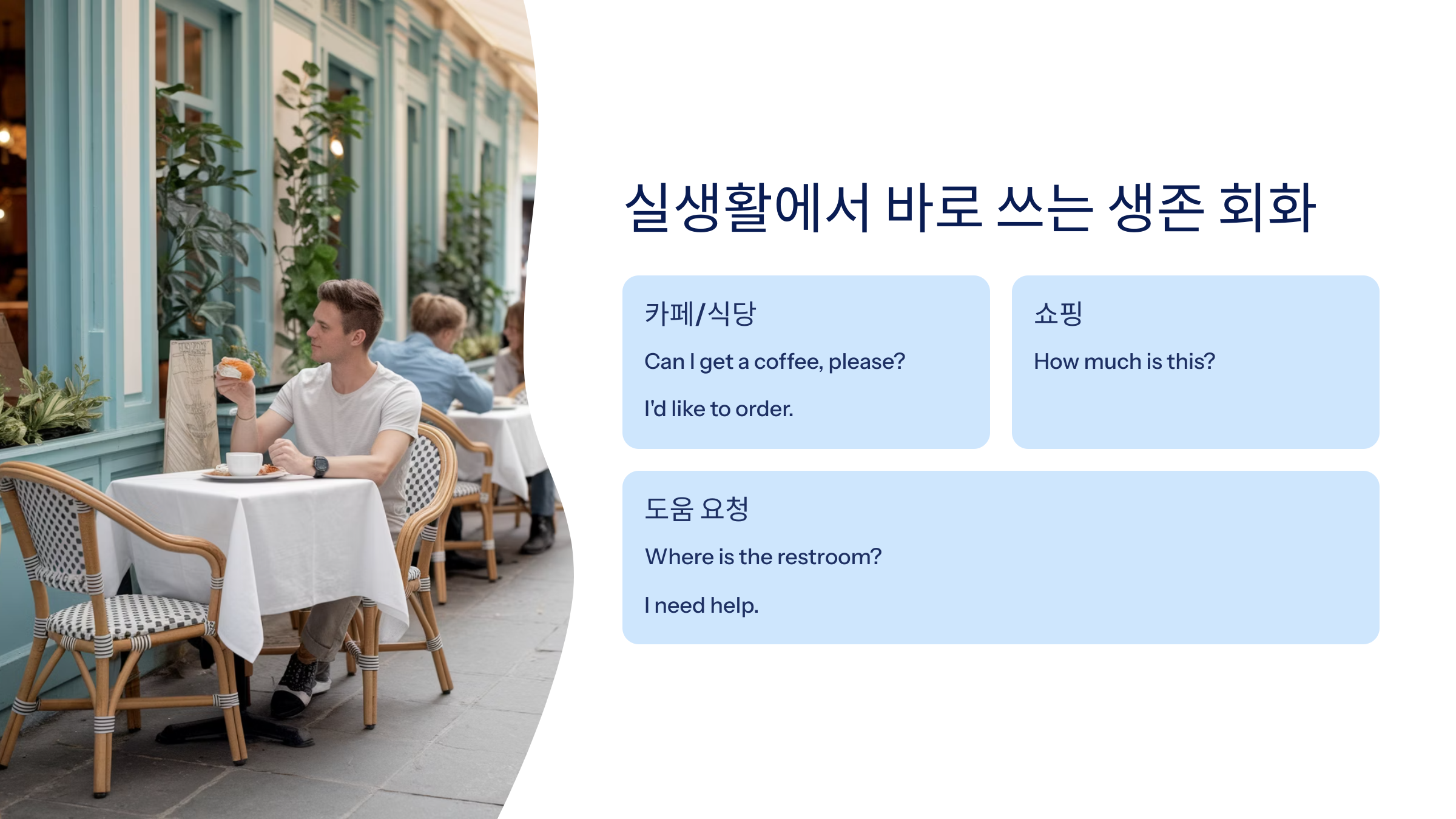 여행, 쇼핑, 식당에서 자주 쓰는 생존 표현도 익혀두면 좋습니다.