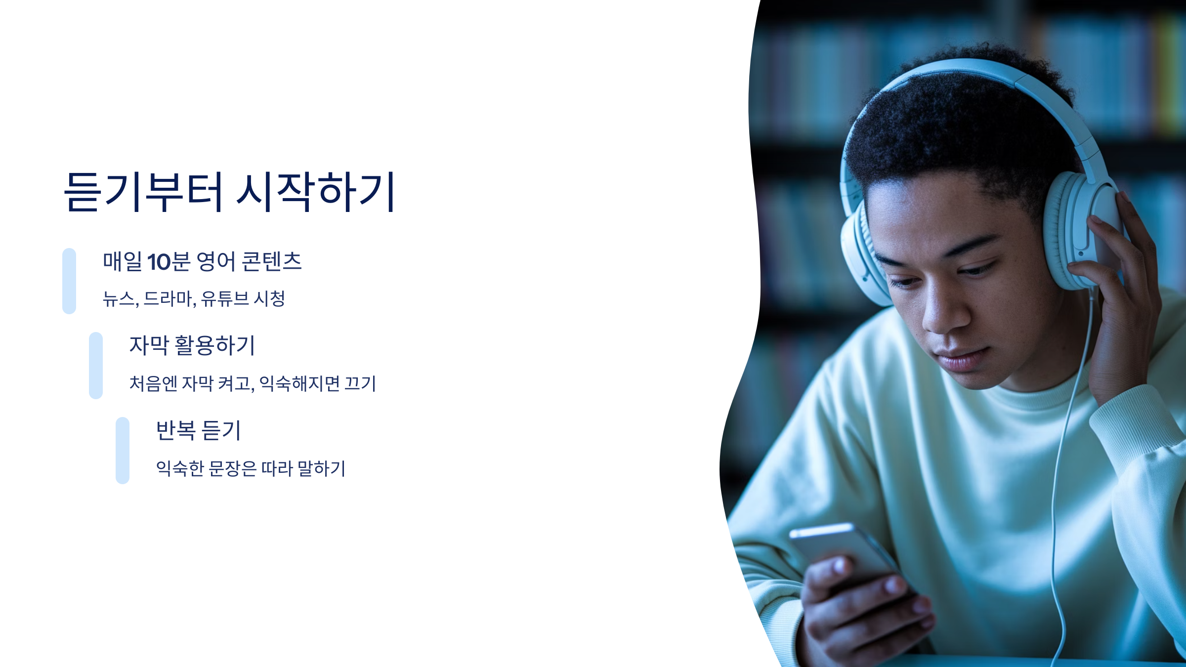영어회화 독학의 출발점은 듣기입니다. 영어를 잘 말하려면 먼저 귀가 열려야 하죠. 다음과 같은 방식으로 훈련해 보세요: