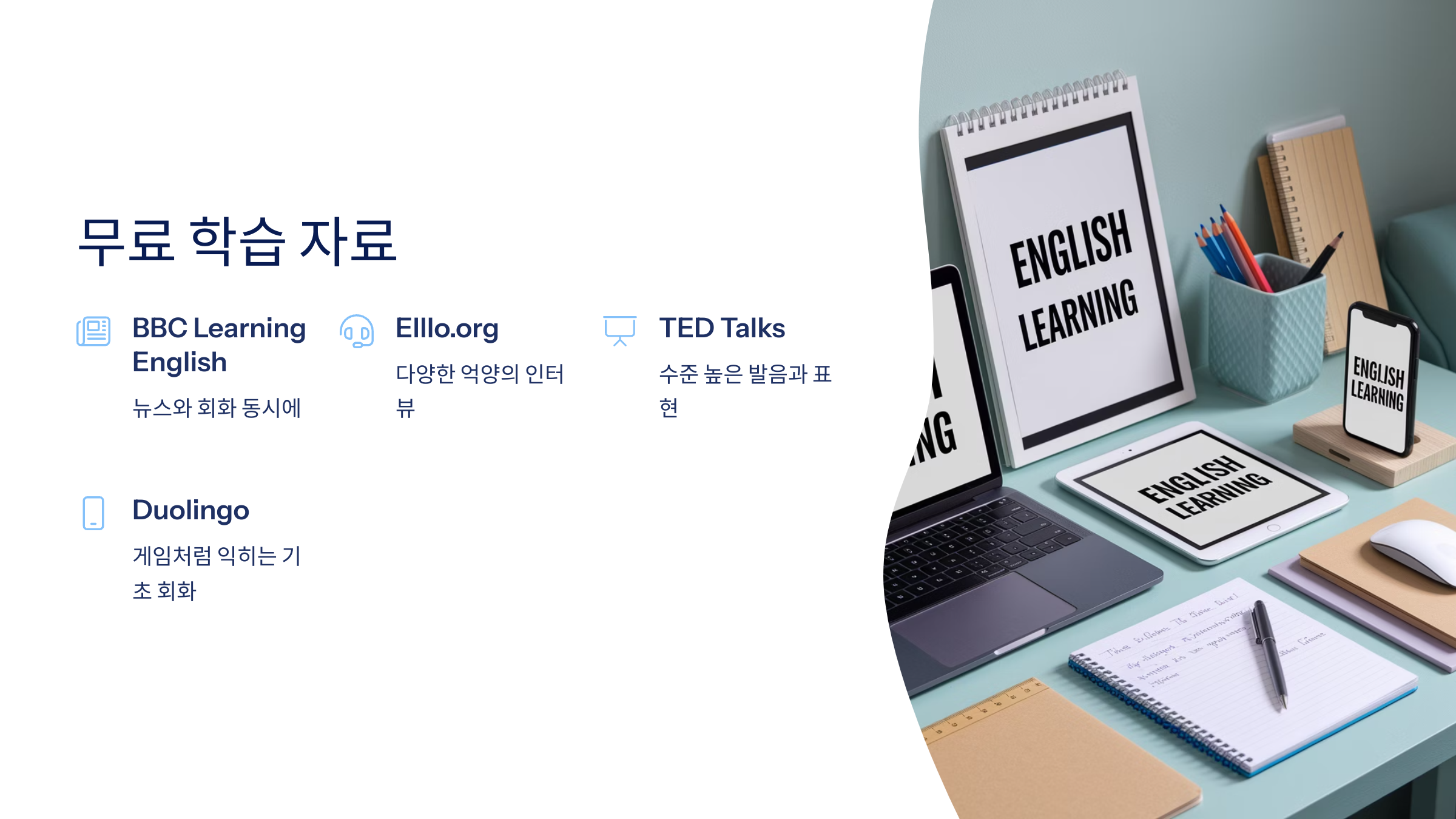 BBC, Duolingo, 유튜브 쉬운 회화 채널부터 시작하세요.