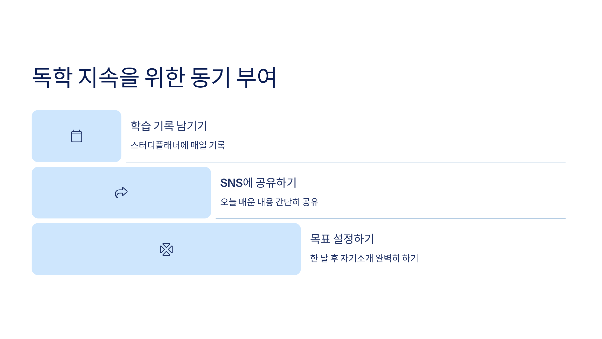 - 목표 설정: 예) “한 달 후 영어로 자기소개 완벽히 하기”