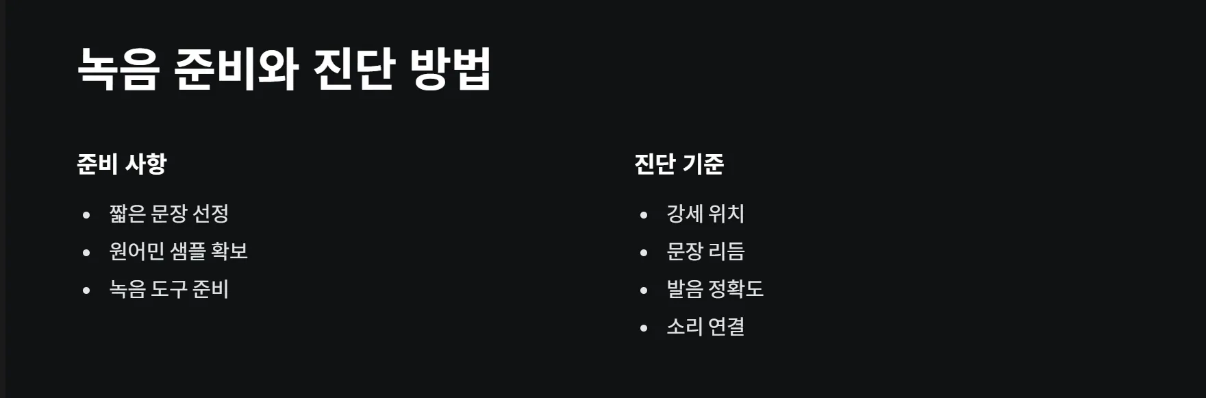 - 소리 연결(Linking): 단어 사이가 자연스럽게 이어졌는가?