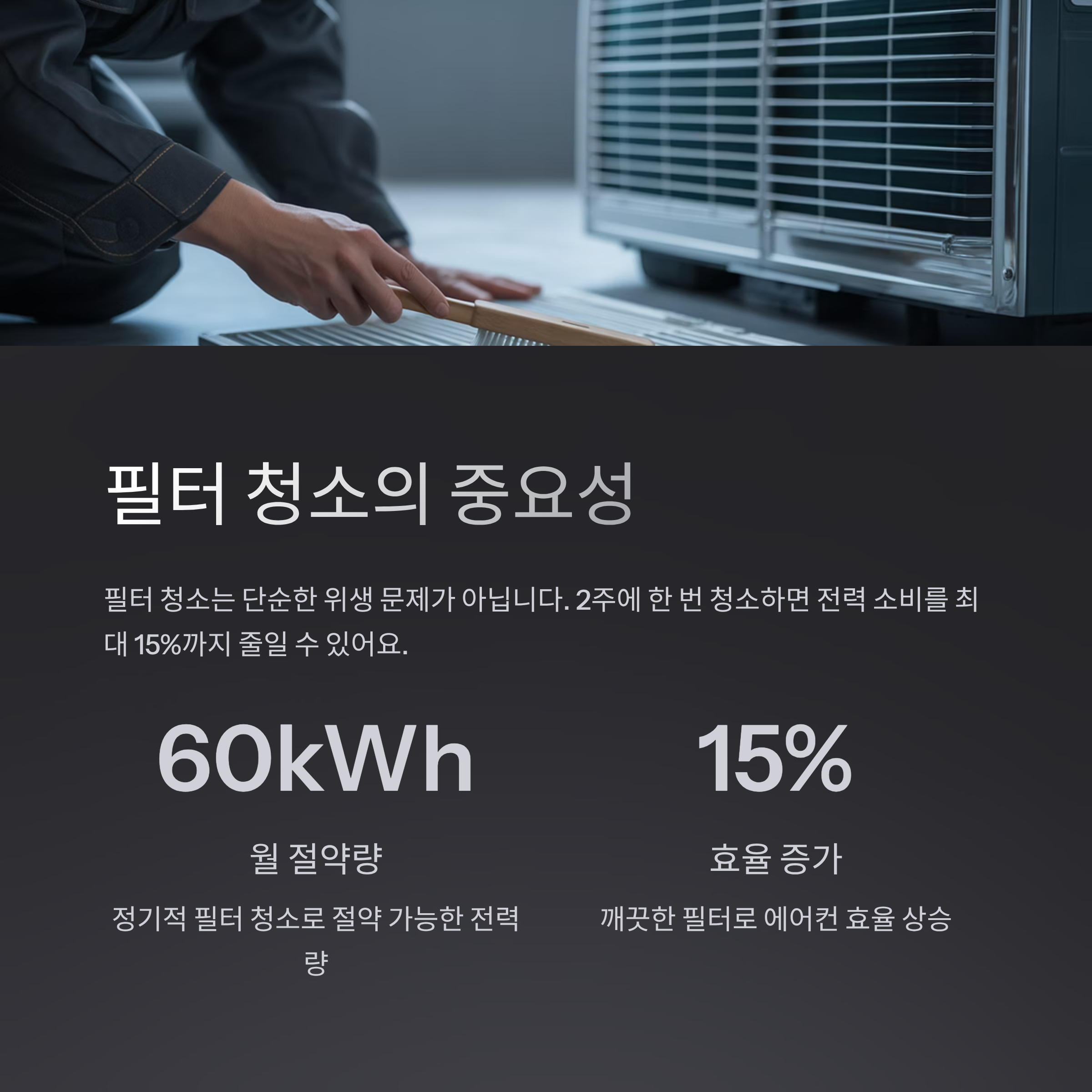 - 정기적인 필터 청소: 에너지공단에 따르면, 2주에 한 번 필터를 청소하는 것만으로도 월 최대 60kWh까지 아낄 수 있다고 해요. 이는 수천 원에서 만 원대 전기요금 절약으로 이어지는 셈입니다. 에어컨을 효율적으로 사용하는 지름길이죠.