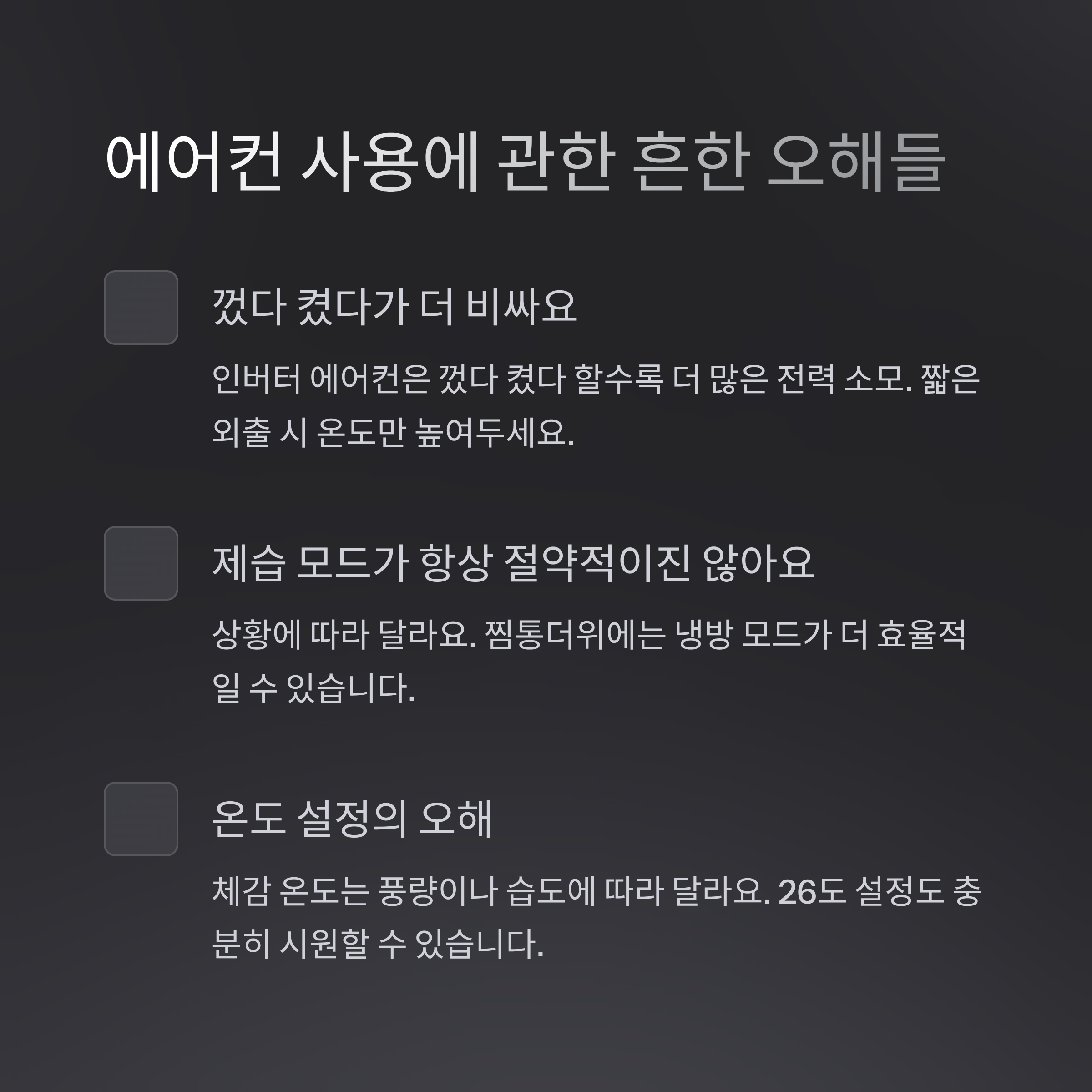 - 껐다 켰다 하는 게 절약이다?: 요즘 인버터 에어컨은 껐다 켰다 할수록 더 많은 전력이 듭니다. 짧은 외출이라면 계속 켜두고, 온도를 27~28도로 살짝 높여주는 게 더 경제적이에요.