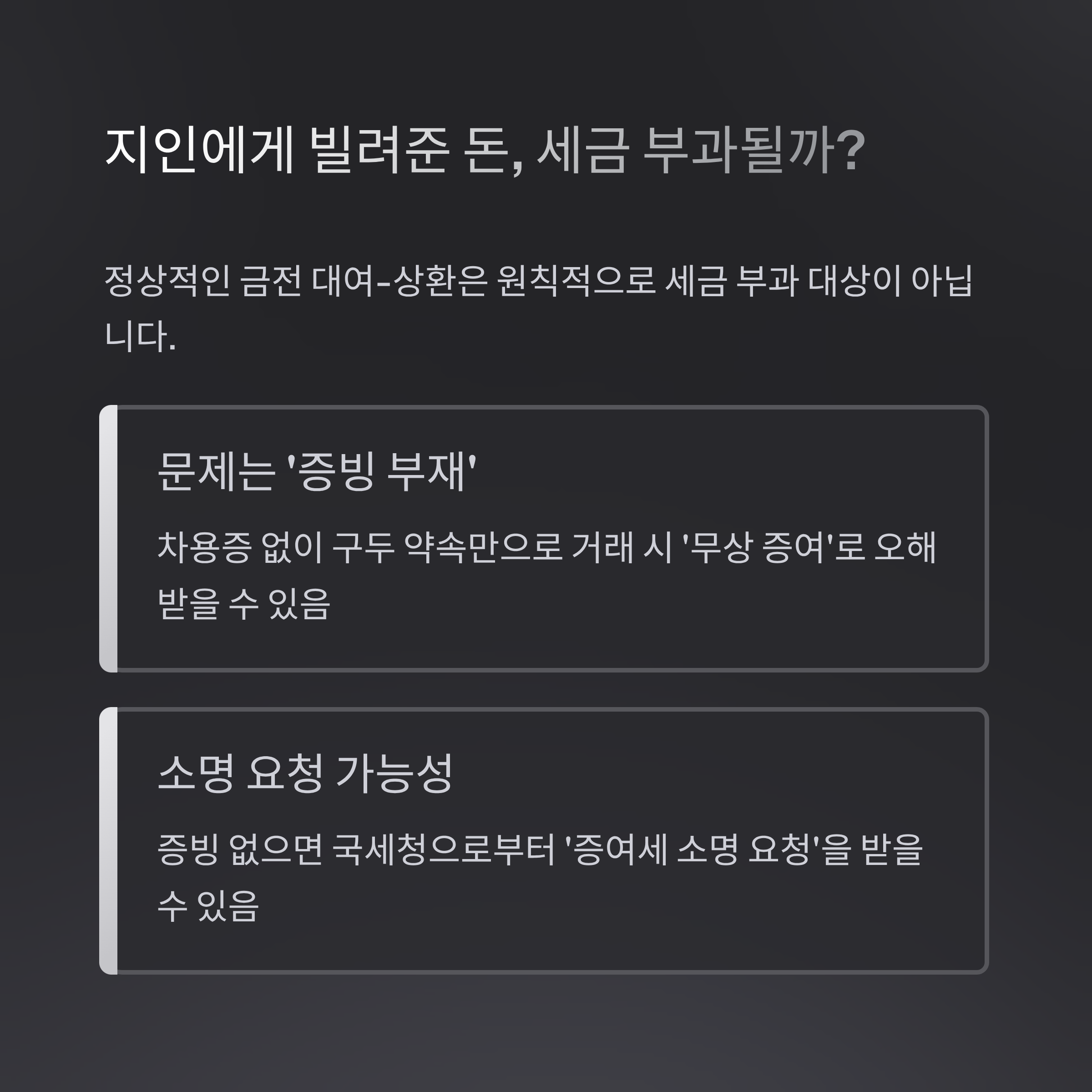 즉, 돈을 빌려주고 돌려받는 거래라고 하더라도, 증빙이 없다면 국세청으로부터 '증여세 소명 요청'을 받을 수 있다는 것이 핵심입니다. 이때 명확한 소명이 이루어지지 않으면 세금이 부과될 수도 있습니다.