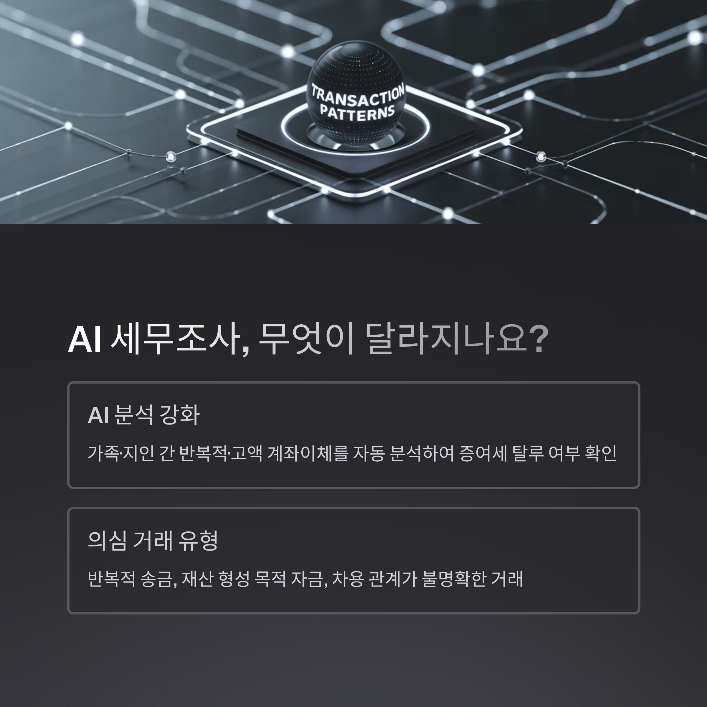 AI 세무조사는 전 국민의 모든 계좌를 일괄 조사하는 방식은 아니며, 특정 패턴과 이상 징후를 포착하여 "과세 필요성이 있는지" 판단하는 선별 분석 체계라는 점을 이해하는 것이 중요합니다.