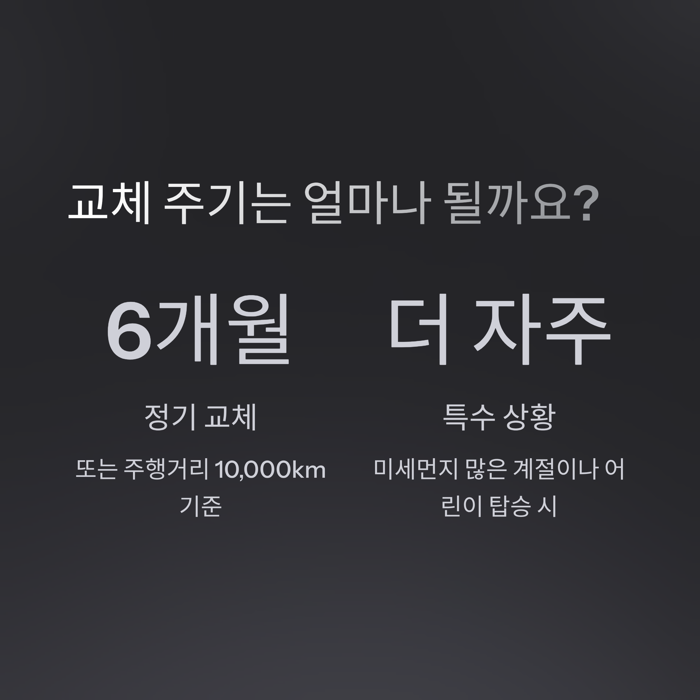 에어컨 냄새가 나거나, 먼지가 심한 날씨에 자주 운행하신다면 더 자주 바꿔주세요.