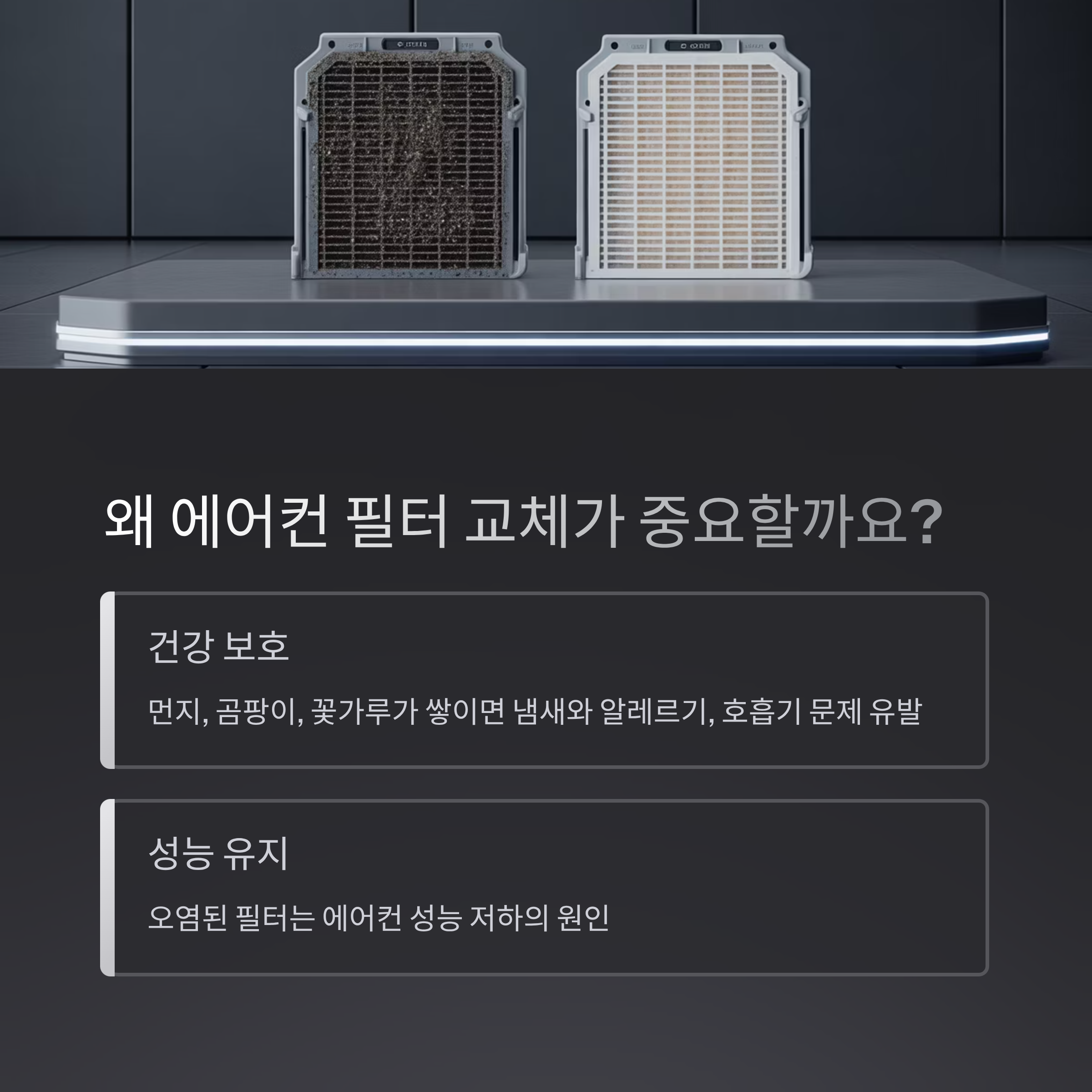 또한 오염된 필터는 에어컨 성능 저하의 원인이 되기도 하죠.